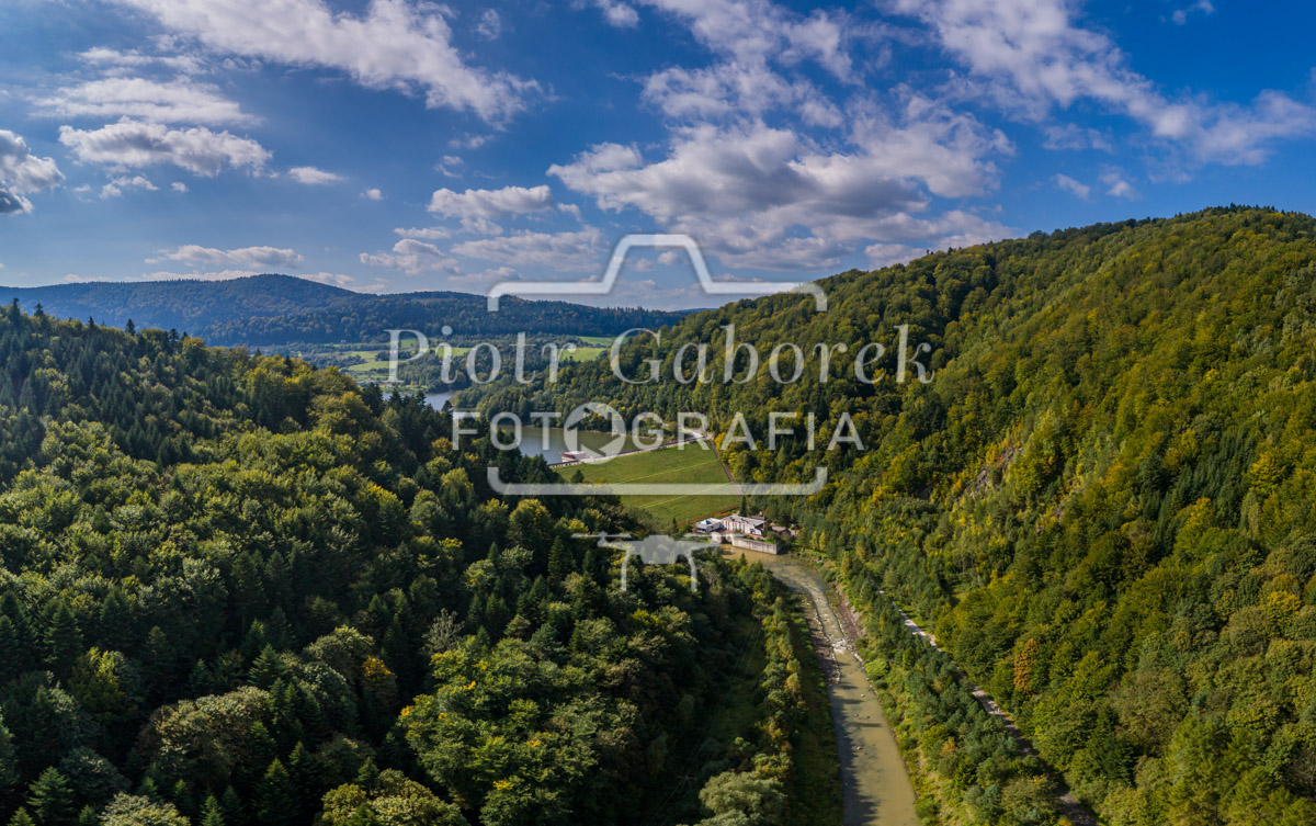 Krajobraz w Beskidzie Niskim, panorama z lotu ptaka w pobliżu zapory wodnej na rzece Ropa. Klimkówka